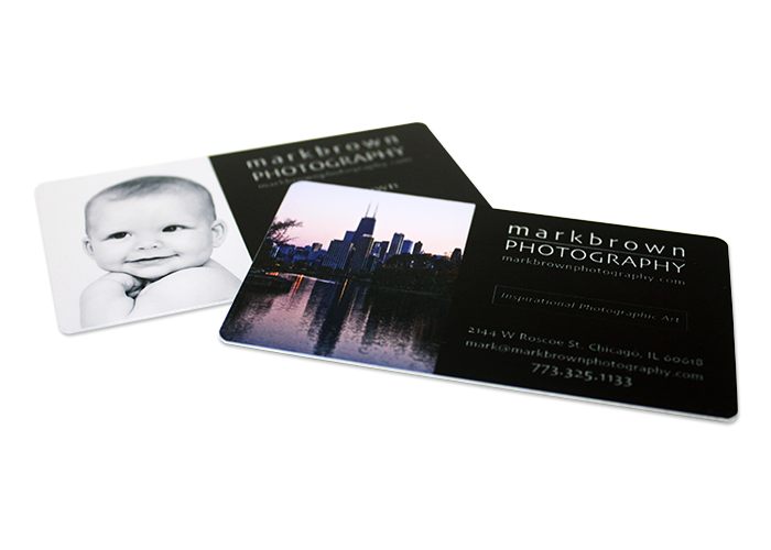 ChromaLuxe™ metal business cards with rounded corners.