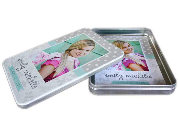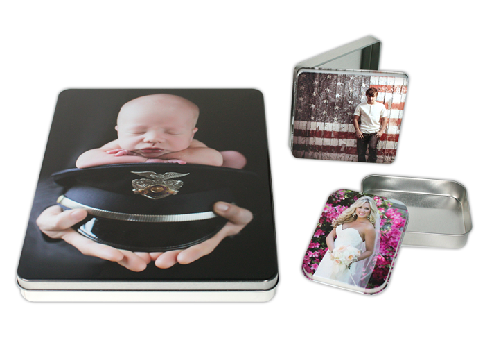 - Wallet, square, 5×7, CD/DVD tin, and flash drive tins are available