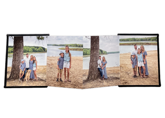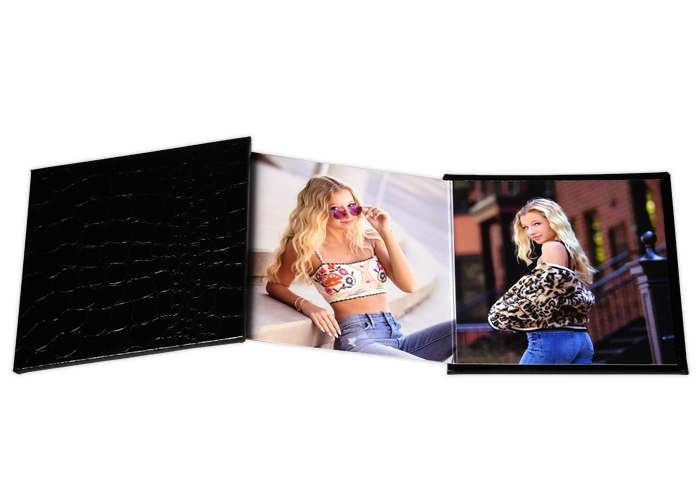 Leather cover accordion books available in press gloss or pearl pages with strong magnetic closure.